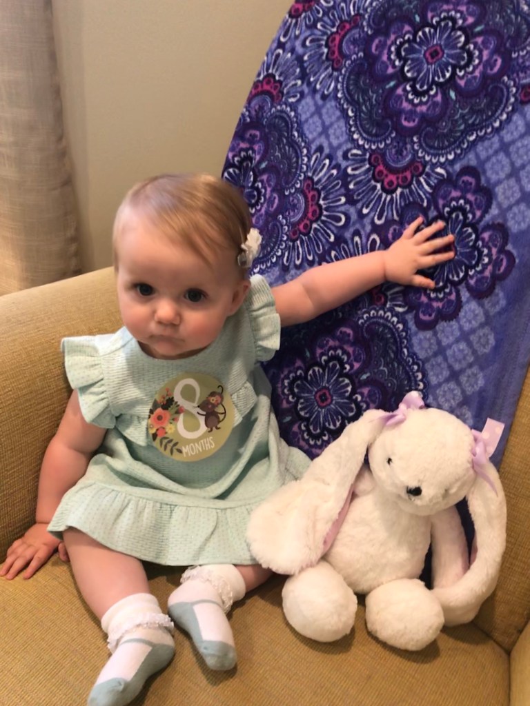 Abby is 8 months old. She loves swinging in her outside swing and reading books. Her favorite foods are yogurt, mandarin oranges, and mozzarella cheese. She claps all the time and babbles non stop. She is about to grow out of her 12 month clothes and is now wearing a size 4 diaper. She has gotten 3 more teeth this month too!