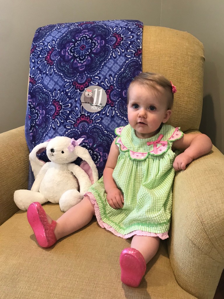 Abby is 11 months old! She is wearing 18 month clothes (and some 24 month), size three shoes, and size 4 diapers.