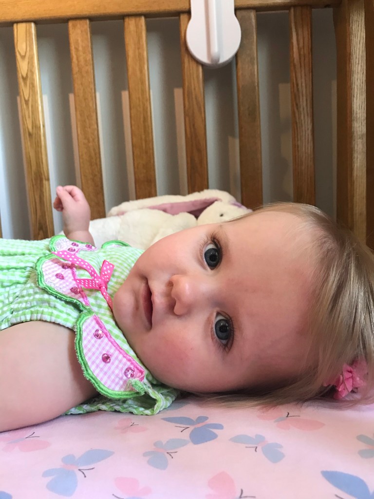 It is like I am watching Trey as a baby all over again. She looks so much like him, I know I always say that but it’s crazy! She has Mikayla’s eyes and eye lashes. My parents say she looks like I did when I was that age. Trey used to sit and play by himself like that too! Both of my boys played good by themselves like that. She is gorgeous I love her dress and her little pink jellies. I also like the doctor pajama outfit maybe she will be a doctor one day! I love you Abby!