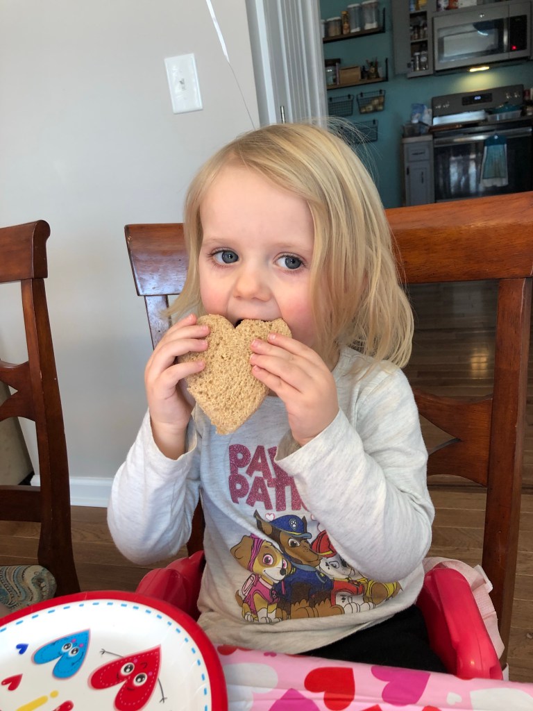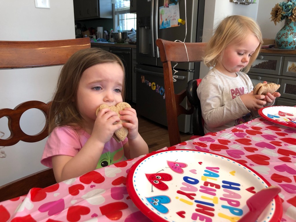 Valentine’s Day was on a Monday so Abby went to play with her friend, Ivy, while Mommy and Daddy went to work. Ivy’s Mom made them heart shaped sandwiches for lunch.