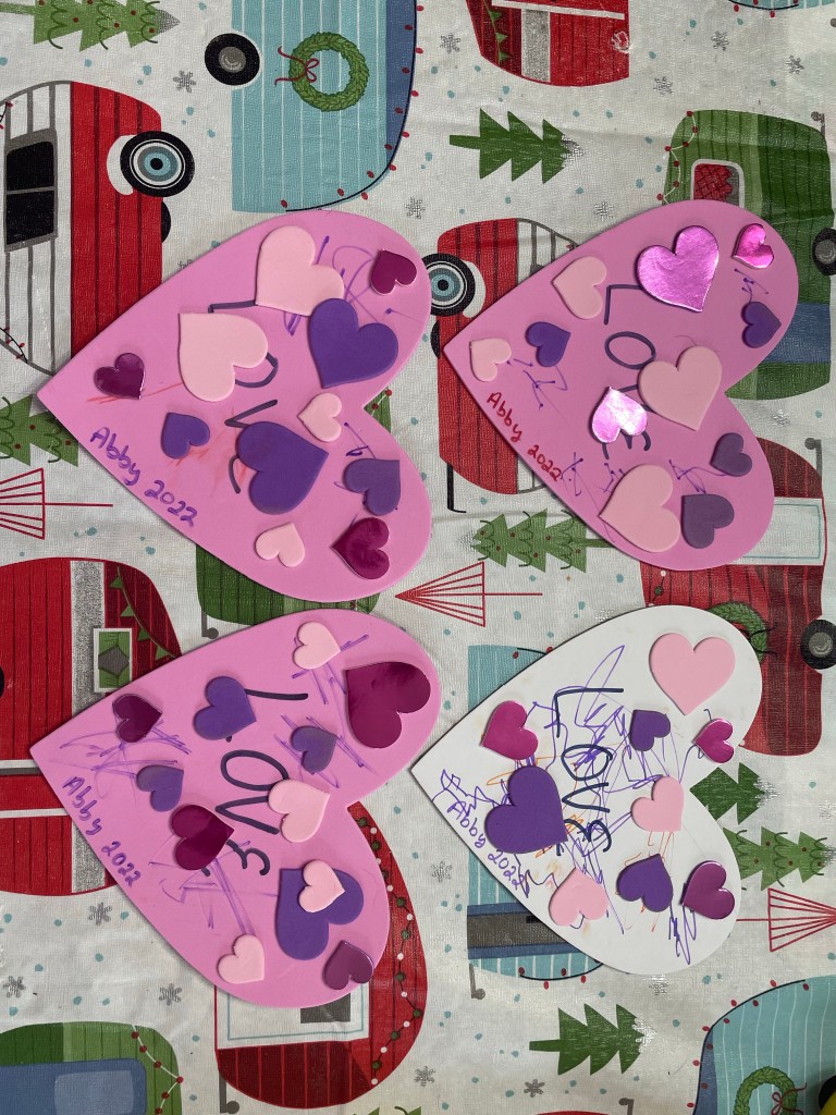 On Sunday, Abby and Mommy made Valentines to give to some of our elderly neighbors. We delivered them with some cookies.