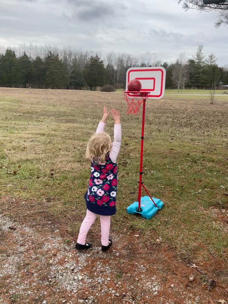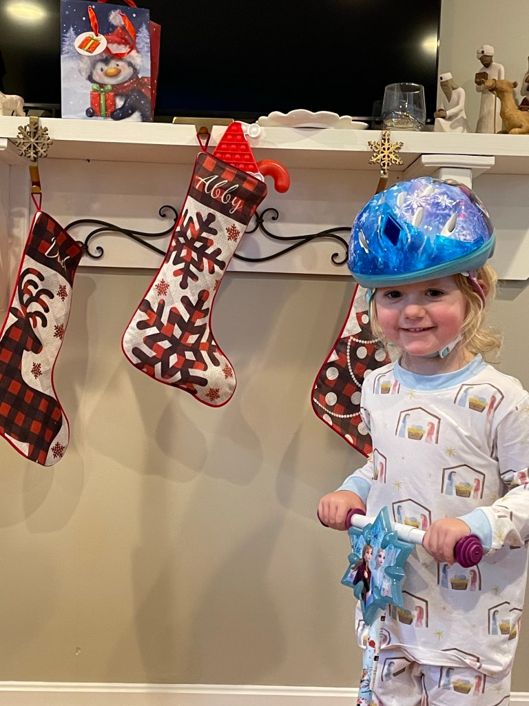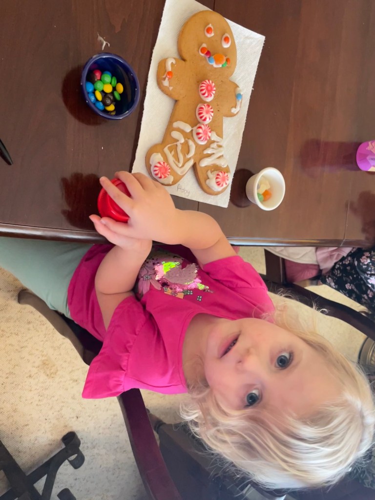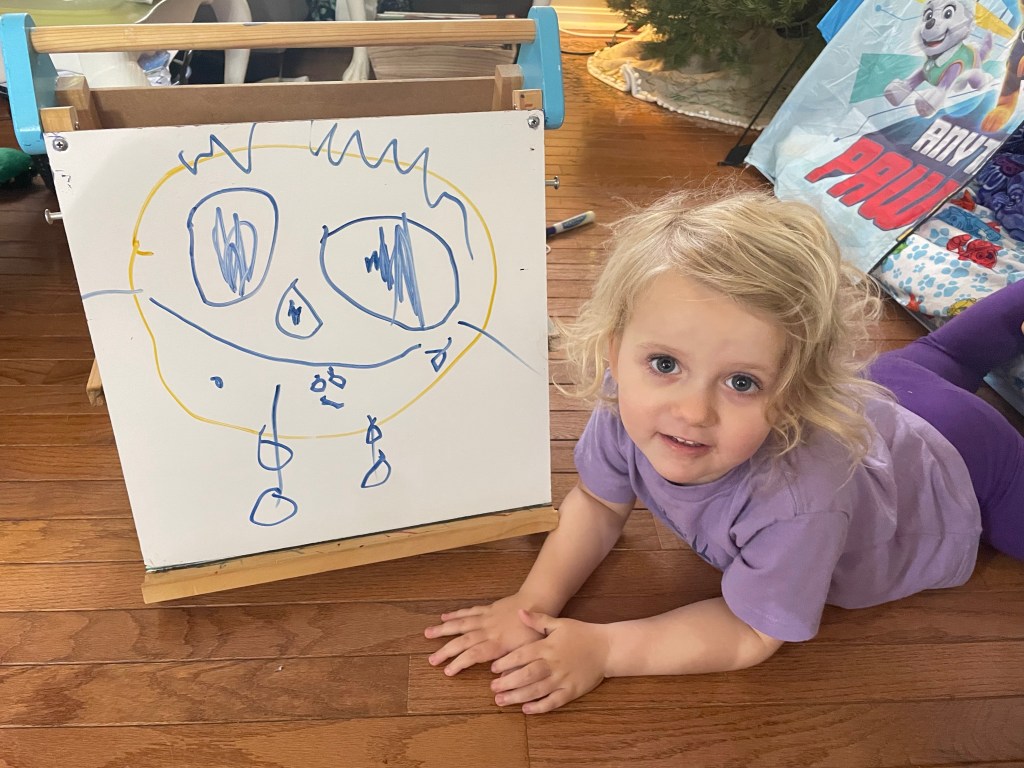 We started with a Santa visit. She was so excited to see him but got shy once she saw him up close.Santa was at bass pro shop so at least she got to visit the fish! We went to have Christmas with Jennifer’s side of the family and Abby really enjoyed being with her cousins!The oldest three really love each other and played until they dropped.A park near her Nana’s (Jennifer’s Mom) house had a huge light village that we walked through. Abby loves Christmas lights!Abby made a gingerbread man!And snowmen ornaments using her handprint. We had a white Christmas! Abby loved playing in the snow.She made snow angels and said, “They are saying happy birthday to God.” 🥰We just sat all her presents out the night before Christmas. She was overwhelmed with all the gifts.Her number one thing that she wanted from Santa was a “Frozen Scooter.” And she has been riding it all over the house. The Peppa pig scooter that the White family sent was passed on to her best friend, Ivy. The too of them have loved riding them together.We had Christmas dinner with Shawn’s Family where she got even more presents.Abby’s Christmas dress came with a matching dress for her doll who she has named Dolly.She got a basket ball hoop for Christmas and she is getting pretty good. He was her fist basket!We rang in the new year at home.Her shirt says “wake me when it’s 2023” but I couldn’t get her to stay still long enough to get a good picture. She is always on the move!Abby has become a very good artist! This is her self portrait!She also really loves her Dolly, especially when their clothes match!