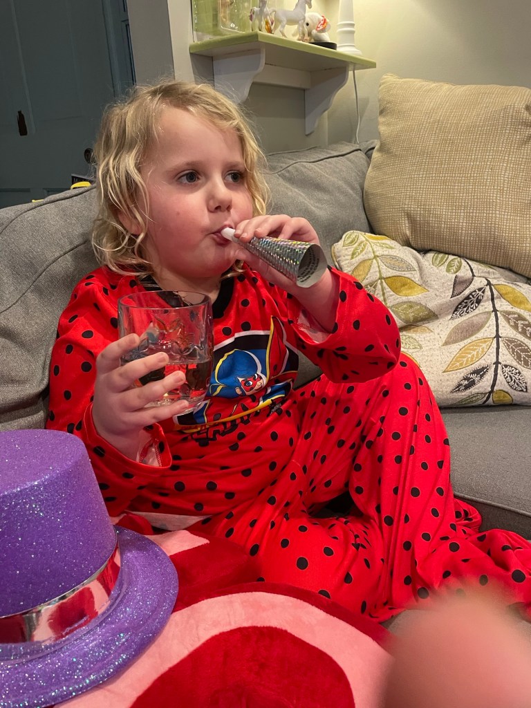 We had sparkling grape juice, watched the ball drop, blew horns, and kissed at “midnight.” She only made it to 9 pm but we had fun anyway.