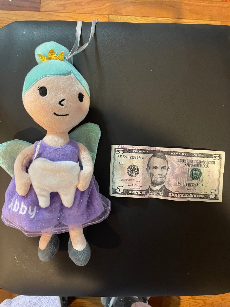 She finally put her tooth in this little tooth fairy pillow and the tooth fairy left a sparkly five dollars!