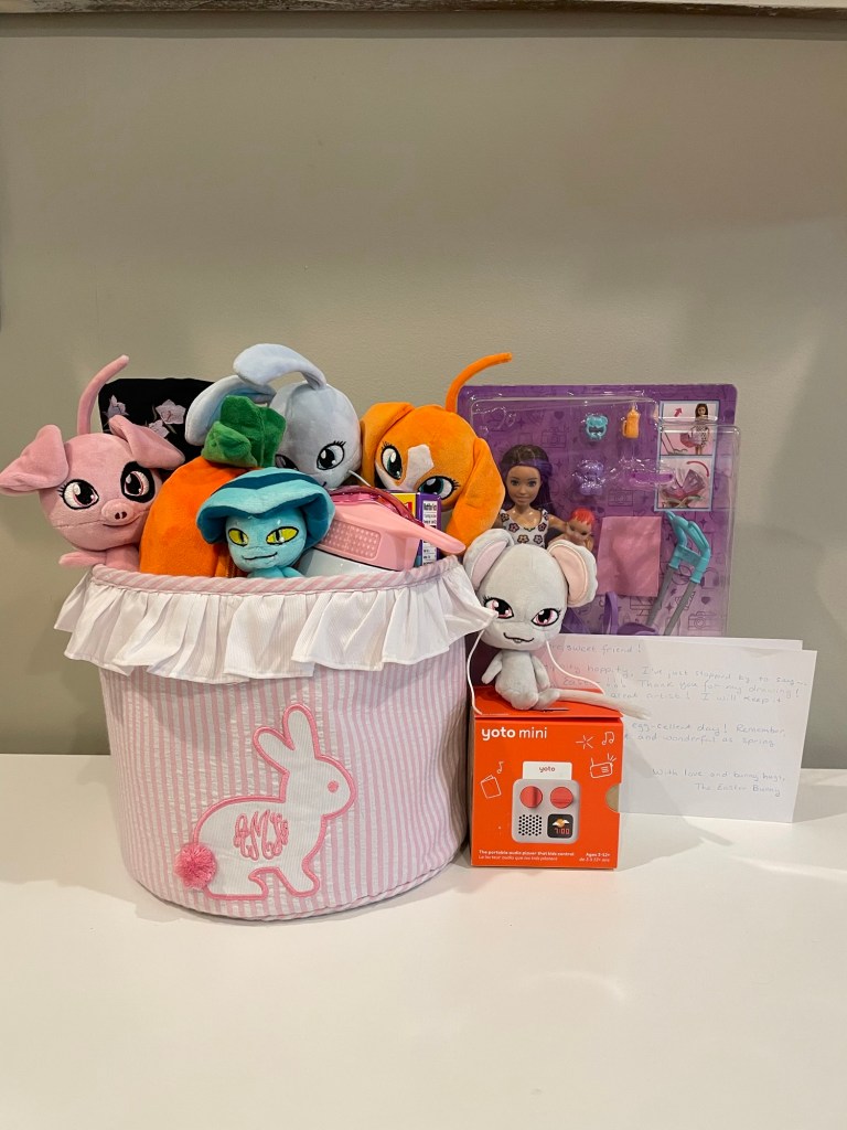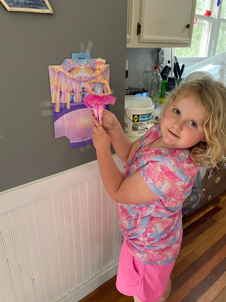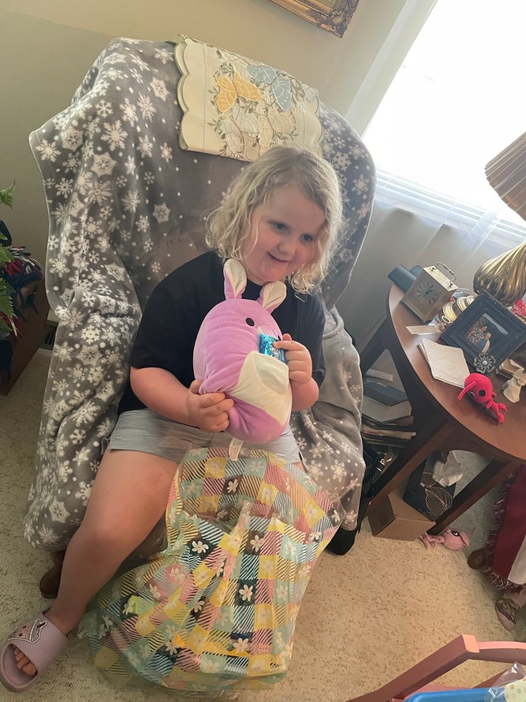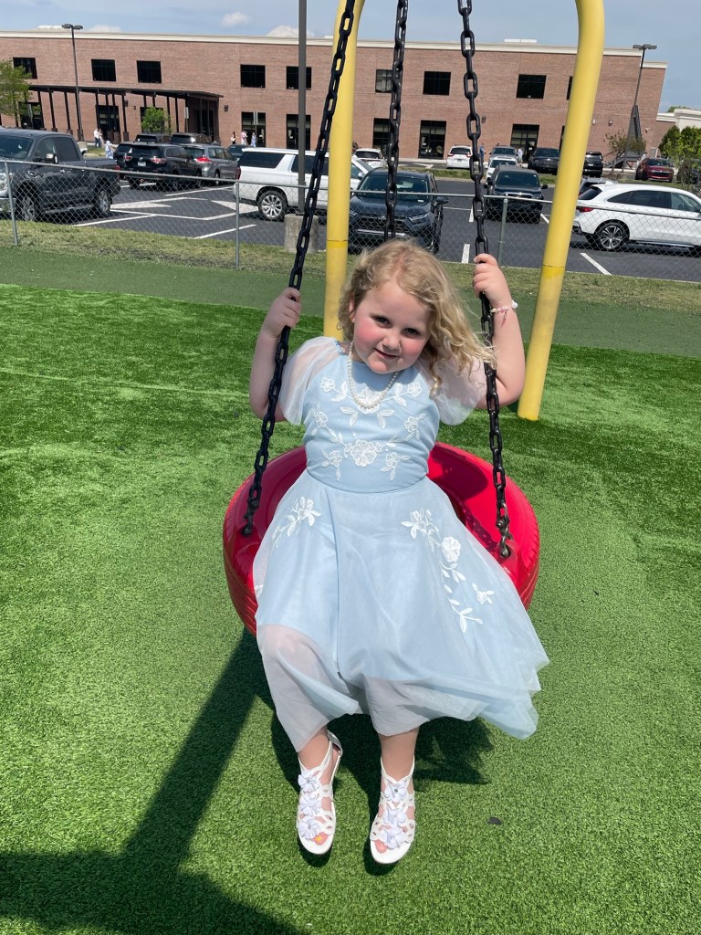 We also had snacks and made sun catchers at our Easter Egg Hunt.She had an Easter party at school . . .. . . With another Easter egg hunt.Cute little bunnies!The Easter bunny came a day early on Saturday.Abby “wrote a letter” to the Easter bunny!Shawn had to work all weekend so we woke Abby up at 4:30 in the morning to see her Easter basket and then Jennifer and Abby went to Knoxville for the weekend.When we got to Nana’s house there was another Easter basket . . .. . . And another Easter egg hunt.Abby enjoyed spending time with her cousins.On Saturday afternoon, we went to Nana’s church for there Easter celebration which included, you guessed it, another Easter egg hunt.They also had bounce houses, snow cones, and a petting zoo.On Sunday we went to church!Here is Abby in her Easter dress!On Sunday afternoon, we went to see the King of Kings movie. Abby says, “I didn’t like the King of Kings movie. I loved it!”Abby is still doing well with her swimming lessons.She loves dance class!Abby is starting to jump rope.She can pump her legs to swing by her self.She loves Barbie dolls! Thank you to Lisa and David for sending this ballerina Barbie!