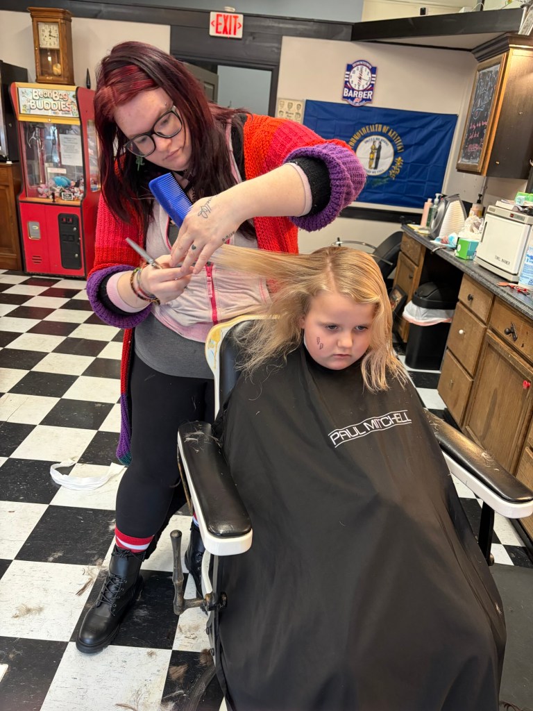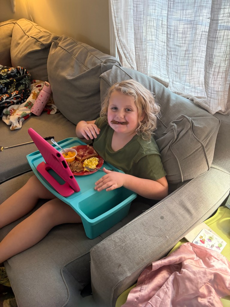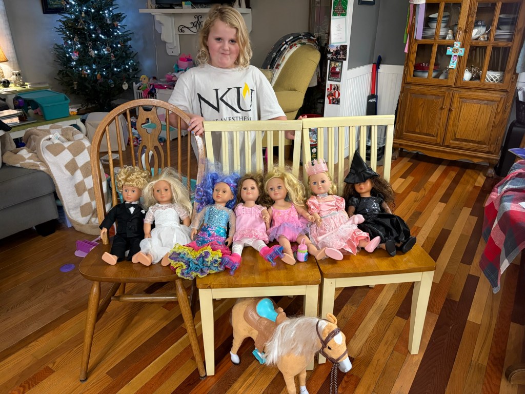 Abby insisted on getting a new outfit for New Year’s Eve! We toasted with Sparkling Apple Cider.She tired her hardest to stay up until midnight but at about 10:30 we looked up a count down on YouTube and celebrated (blew horns, toasted, kissed, etc.) then went to bed.This was New Year’s Day breakfast. Abby’s new years resolution is to eat 5 fruits and vegetables everyday and so far she is doing great!Over the break we had lots of days of play at home. These 18 inch dolls are her favorite toys right now.We went to lights under Louisville and she loved it!We went to the science museum.Abby got her first professional haircut.We had some warm days and went to the zoo.Thank you for all the Christmas gifts that were sent to Abby! We have enjoyed them all! Here we are playing the Hello Kitty Game while we wait for our food at a restaurant.Unfortunately, Shawn’s Mom passed away a few days after Christmas. Abby is upset of course but we all take comfort that she is no longer in pain and that we will see her again in heaven one day. The memorial service won’t been until sometime in February.